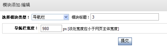 首先,我们先到网站顶部添加一个导航模块,模块栏类型选择导航栏,模块标题任意填写,导航栏宽度建议小于您的网站主体宽度(网站主体宽度可在全局设置中修改)