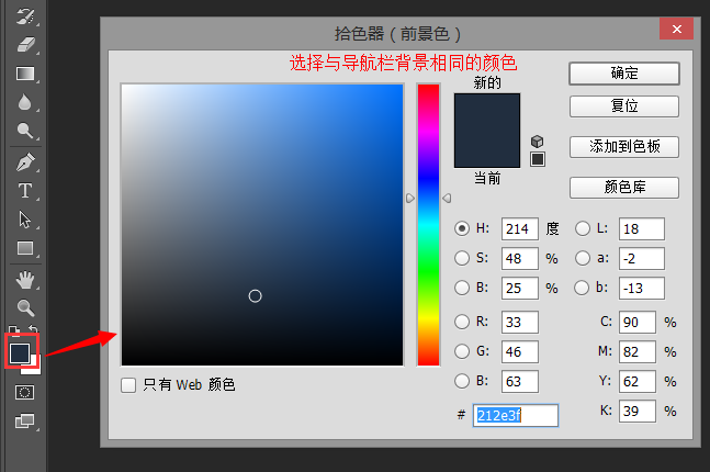 然后点击工具栏中的前景色选色面板(背景色也可以),选择与导航栏设置的背景相同的颜色