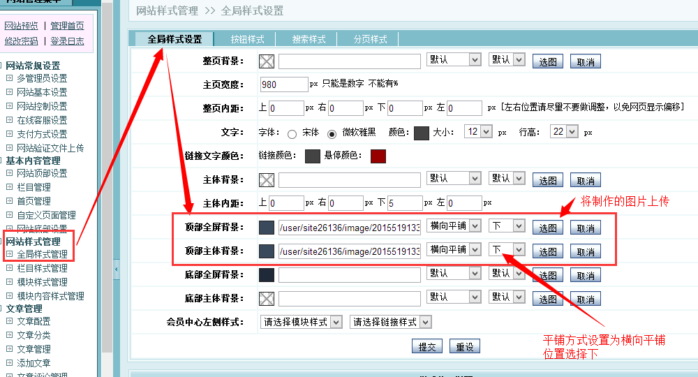 在这里找到网站顶部主体背景和网站顶部全屏背景,选择您刚刚制作的背景图片,平铺方向设置为横向平铺,位置设置为下