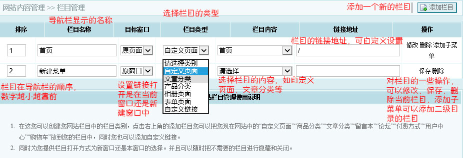 操作:对栏目的一些操作,可以修改,保存,删除当前栏目,添加子菜单可以添加二级栏目