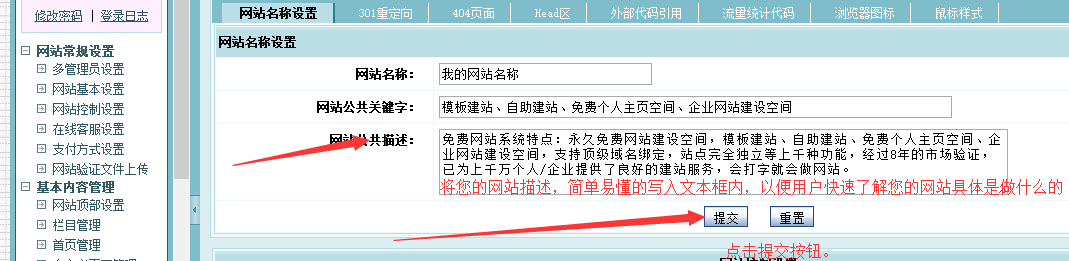 首先要进入您的网站后台,点击网站基本设置》网站基本名称》网站公共描述