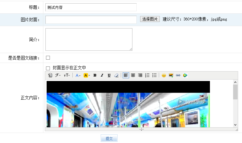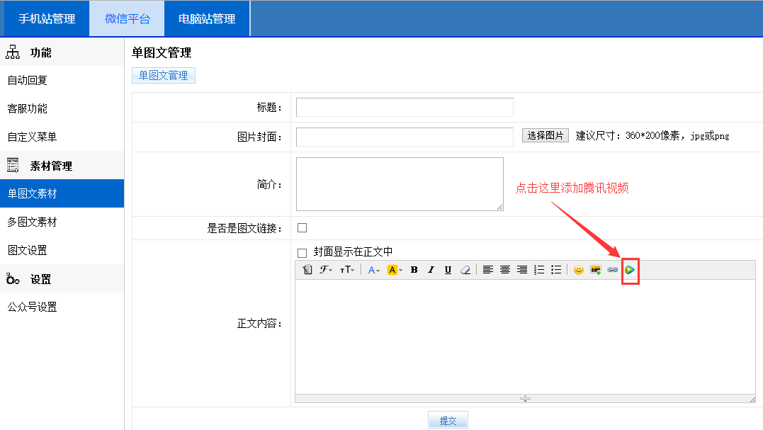 如果您在网上看到一个比较有意思的视频,想分享到您的公众号中,可以在单图文素材中添加视频